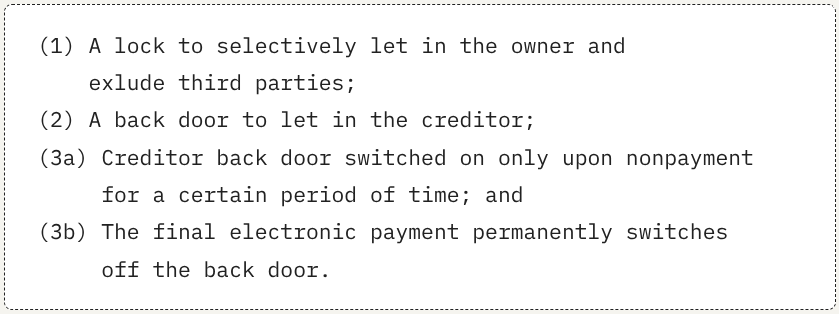 Way back in 1997, Nick Szabo described the utility of turning smart contracts into smart locks: “Many kinds of contractual clauses (such as collateral, bonding, delineation of property rights, etc.) can be embedded in the hardware and software we deal with, in such a way as to make breach of contract expensive (if desired, sometimes prohibitively so) for the breacher.”