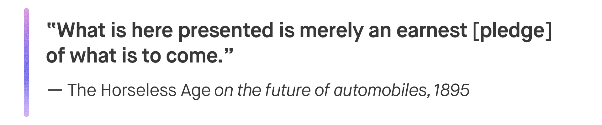 “The appearance of a journal devoted to a branch of industry yet in an embryonic state may strike some as premature,” The Horseless Age conceded in its very first article. “But those who have taken the pains to search below the surface for the great tendencies of the age, know what a giant industry is staggering into being there.”