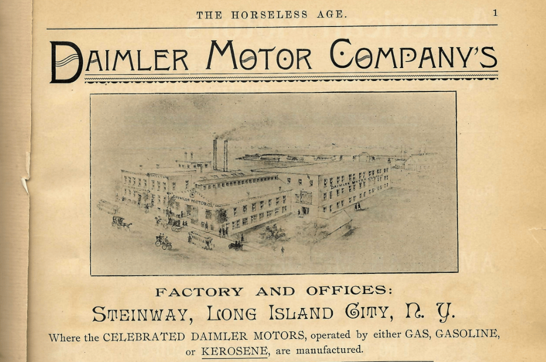 Modest as things were, The Horseless Age found that its audience of mechanics, inventors, engineers, parts-makers, and engine builders was attractive to advertisers. One of its first was the Daimler Motor Company, which took out a full-page ad touting the “gas, gasoline, or kerosene” motor vehicles it was building in a Long Island factory owned by Steinway.