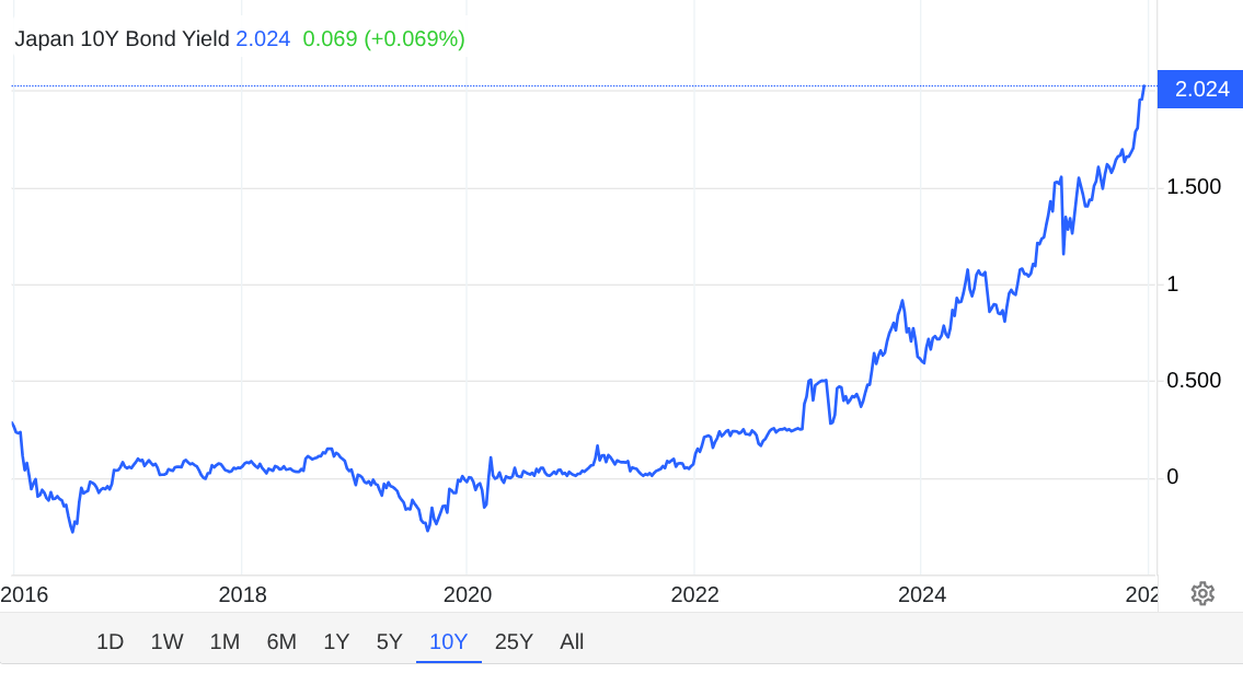 The yield on 10-year Japanese government bonds is about 2% for the first time since 1999. Higher yields typically mean Japanese savers will sell US investments to reinvest at home, but the opposite seems to be happening, likely because of the appeal of US AI stocks.