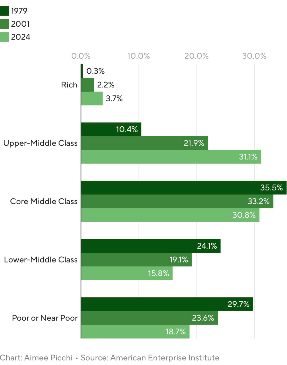 Americans have spent decades worrying about âthe shrinking middle class.â Data from the AEI shows that itâs been shrinking because people have been moving up, not down. In 1979, 10.4% of Americans belonged to the âupper middle class.â Now, itâs 31.1%.