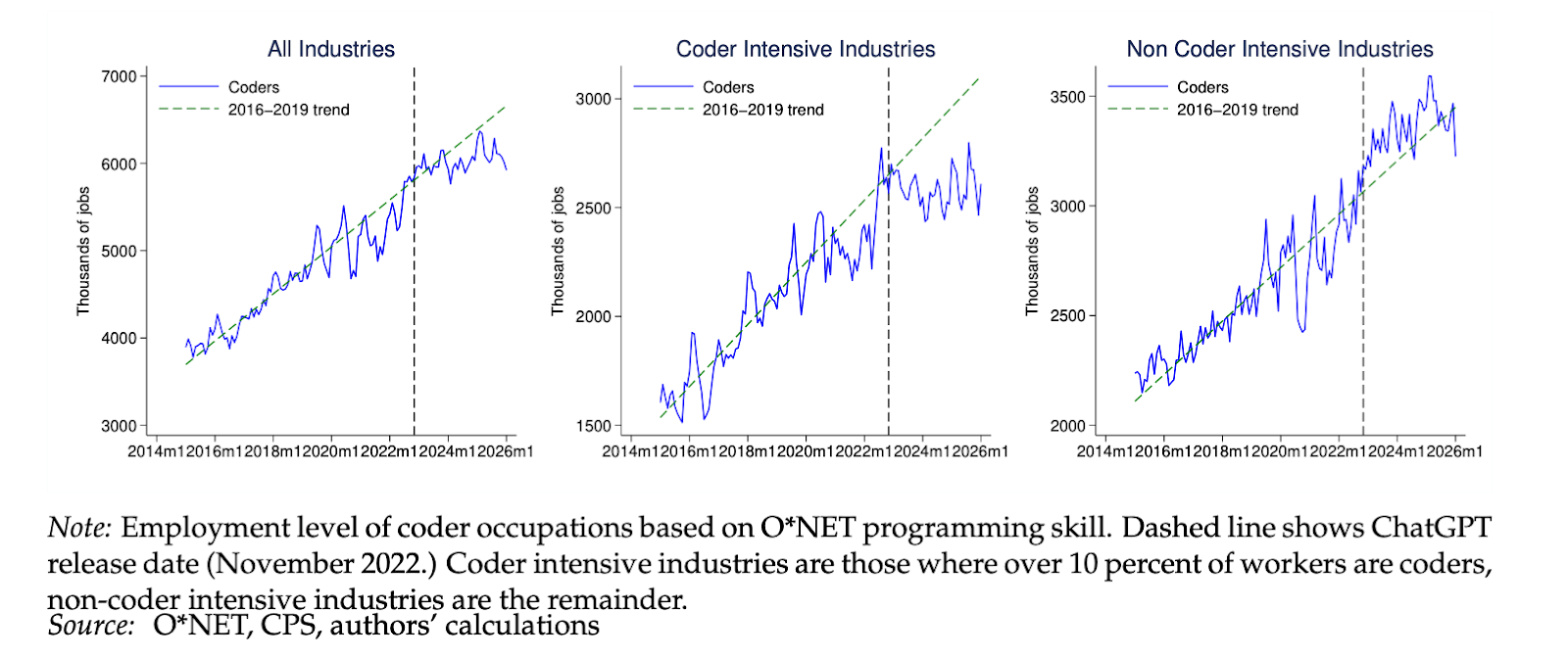 Research from the Federal Reserve finds that worries about AI have âbeen suppressing coder employment growth by (conservatively) about 3 percent per year since the introduction of ChatGPT.â