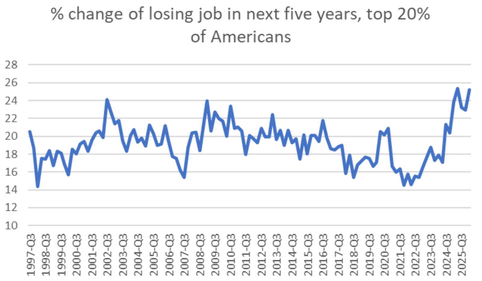 Callum Williams charts Michigan survey data showing that nearly 26% of top-decile earners think they could lose their job in the next five years. âAmericaâs elite has never been more worried about losing their job,â he concludes. (âNeverâ meaning from the start of data in 1997.)