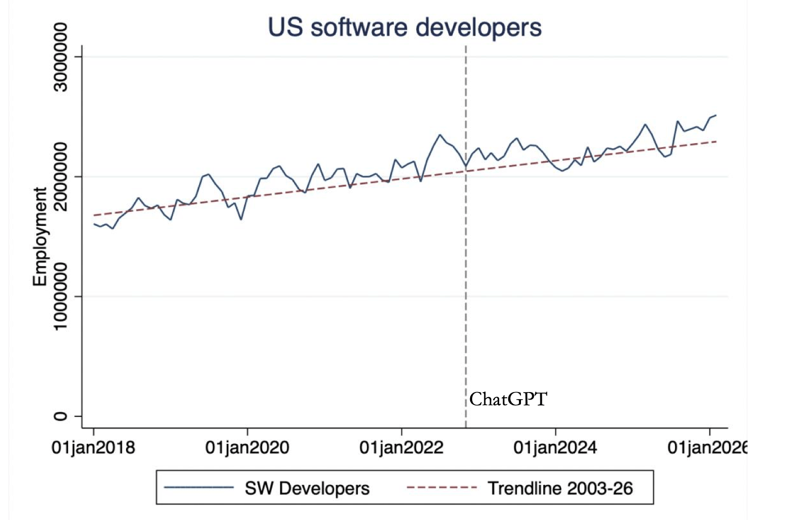 Another study concludes that âthe number of software developers in the US has grown by over 400,000 since ChatGPT was introduced in 2022.â