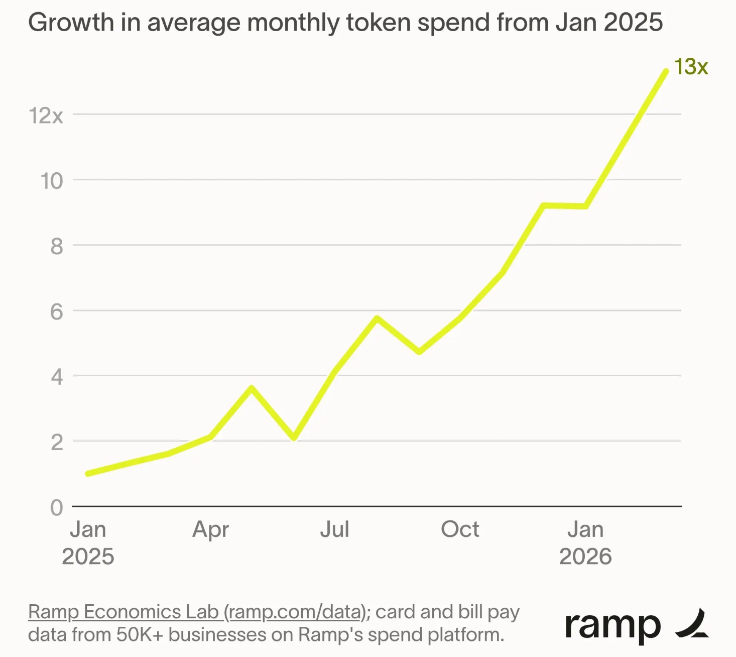Data from Ramp shows that its customersâ spending on LLM tokens is up 13x from the start of the year (when agentic AI first took off).