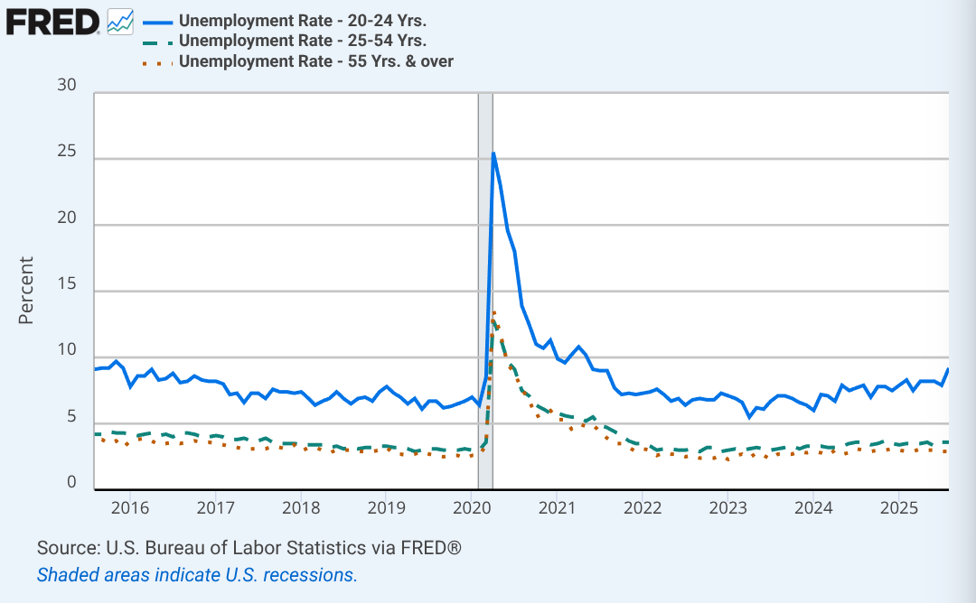 Younger workers could use some help from the Fed. The last time the BLS collected data (way back in August) the unemployment rate for 20-24 year-olds had risen to 9.2%.