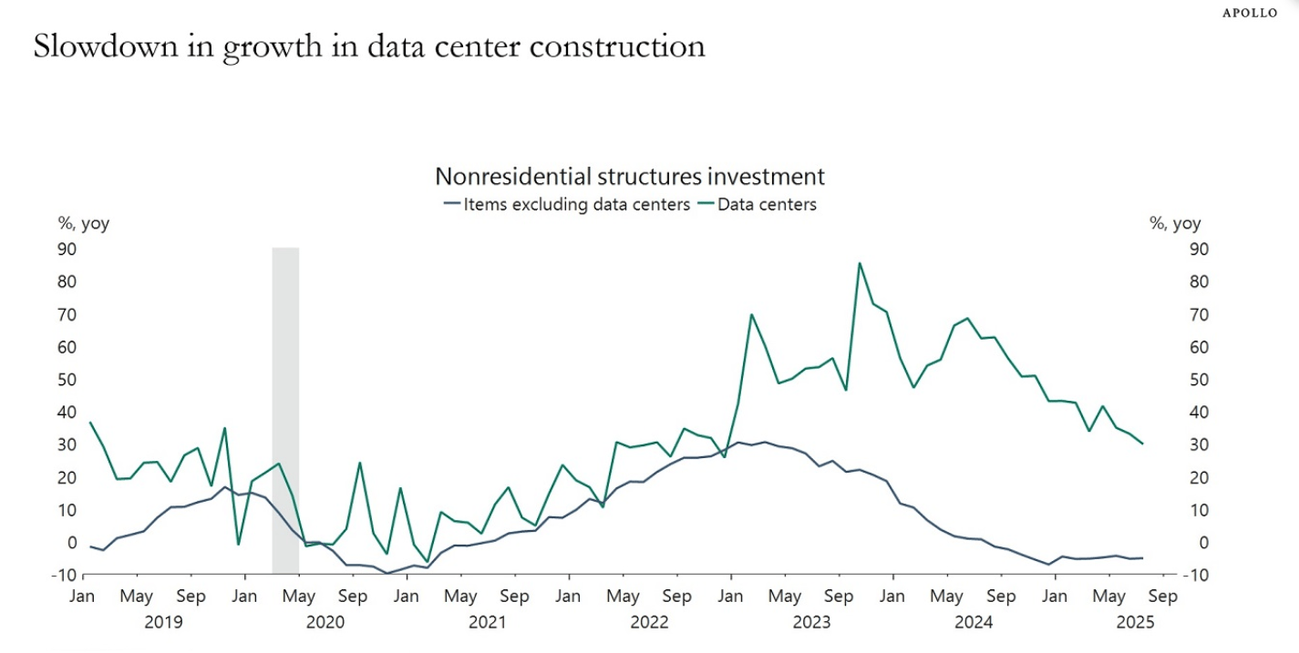 Torsten Slok notes that investment in data centers is still growing (rapidly), it’s growing at a slower rate. My guess is they can’t build the power generation fast enough to keep up. (There would be no such issue in space.)