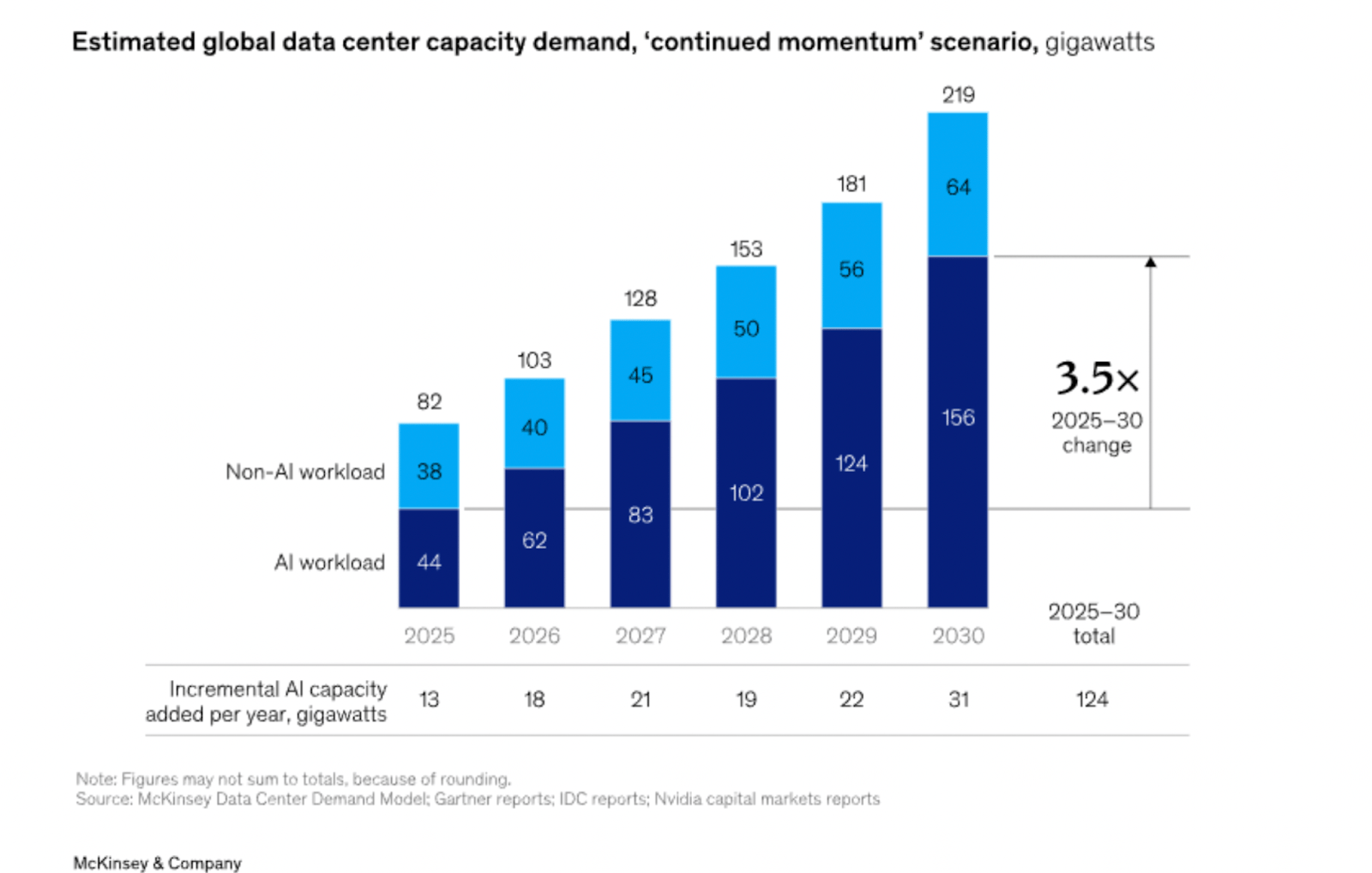 McKinsey estimates that AI workloads in data centers will increase 3.5x between now and 2030. If that’s right, and it all gets funded, and the power grid can support it…the stock market might not be in a bubble.