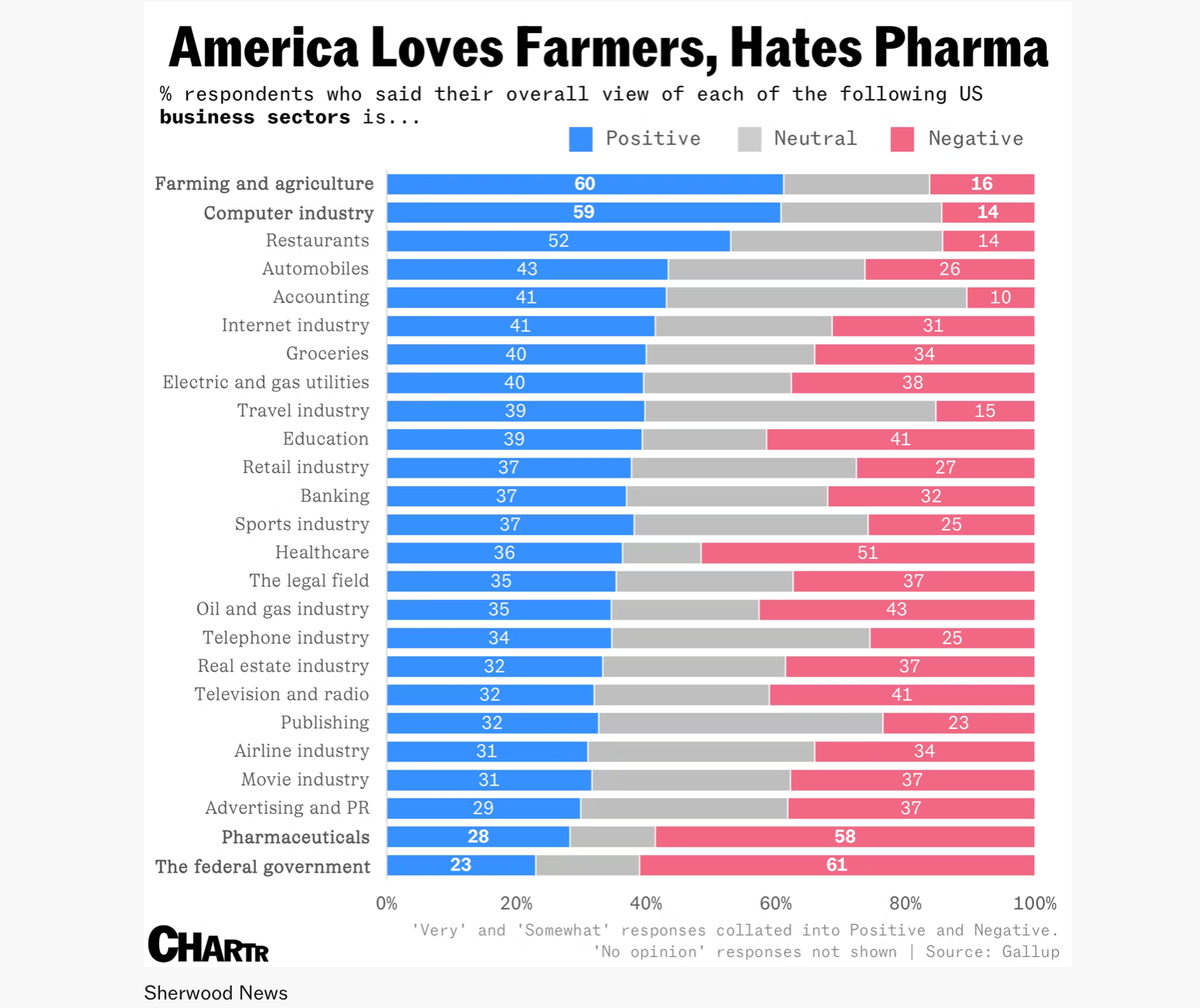 The “computer industry” is second to only farmers in a survey of how people feel about US business sectors. The internet industry finished a respectable sixth. (Not shown: newsletter writing at 100% positive.)