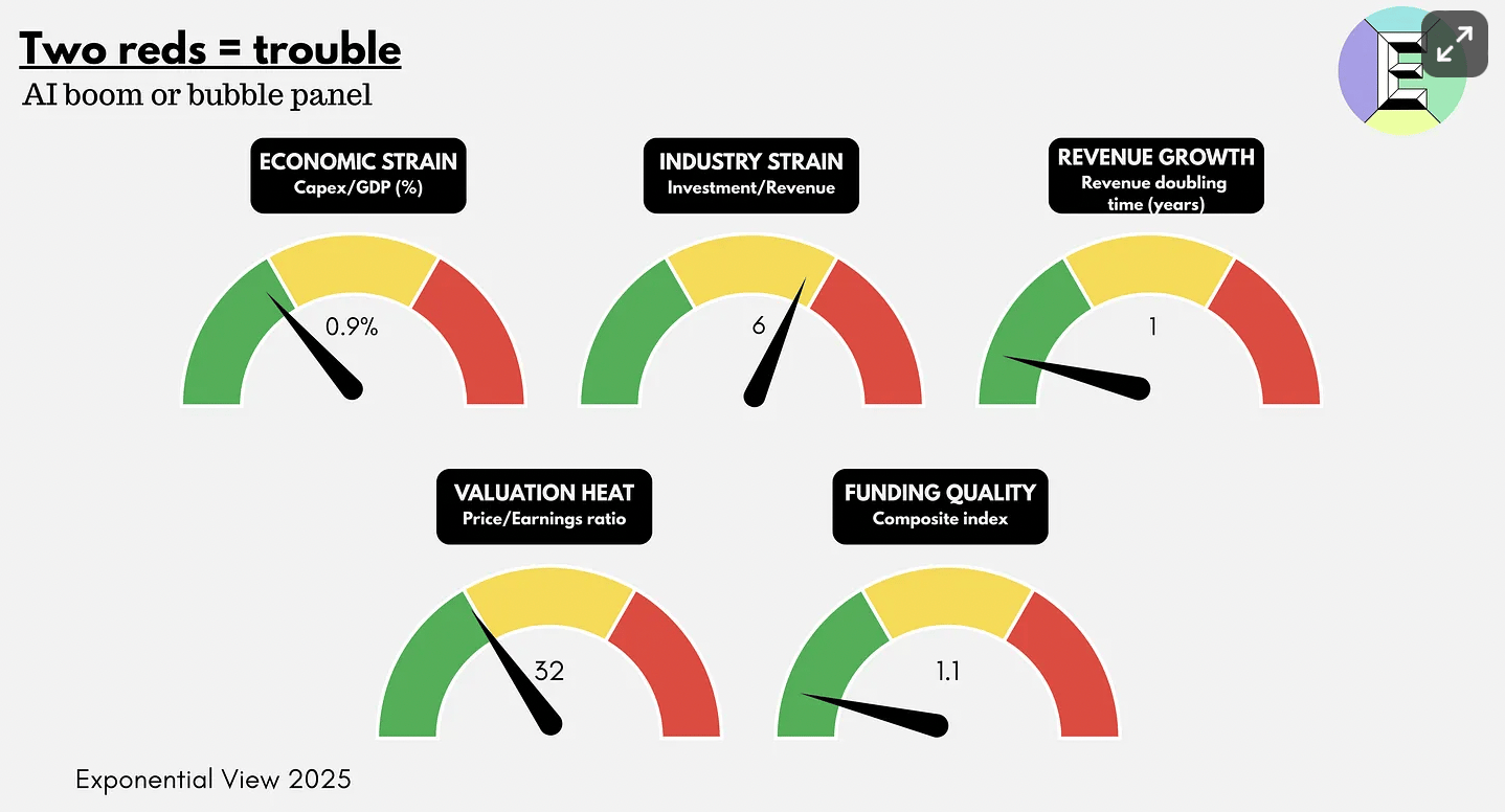 Azeem Azhar helpfully gives us some metrics to watch and concludes we’re not in bubble territory yet. Whether these indicators would flash red in time for investors to get out is another question (I doubt it).