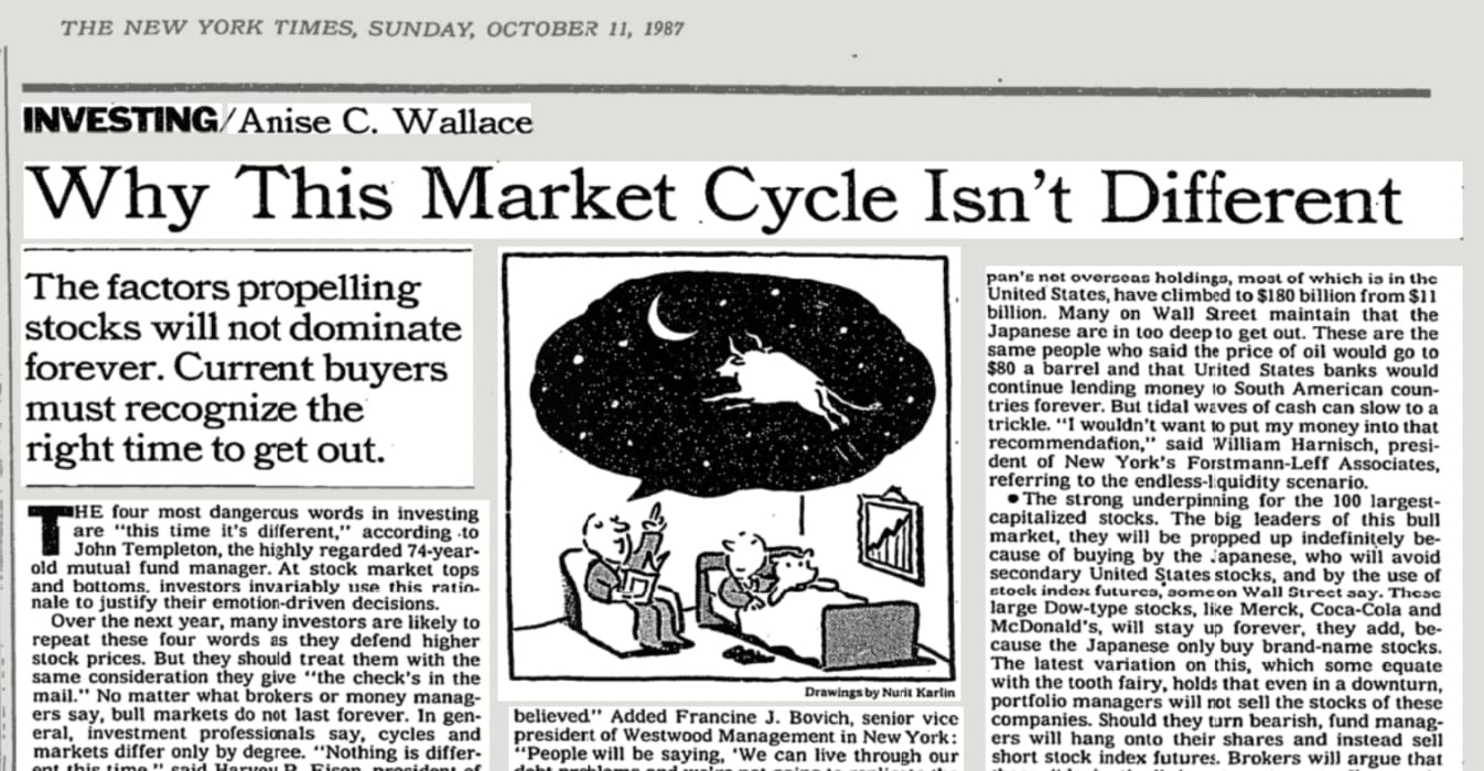 Sir John Templeton’s adage about the four most dangerous words in investing first appeared in a 1987 New York Times article warning that the bull market in stocks was getting long in the tooth: “It is late and investors must be very cautious.”