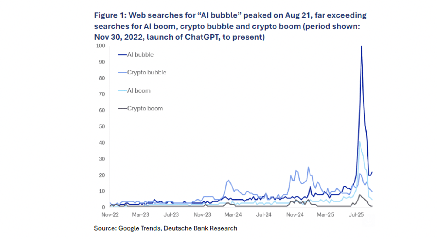 Deutsche Bank’s data on web searches suggests that media references to an AI bubble was itself a bubble that’s already burst. But that doesn’t mean we’re in the clear: “The moment everyone spots it may be the moment it is least likely to burst.”