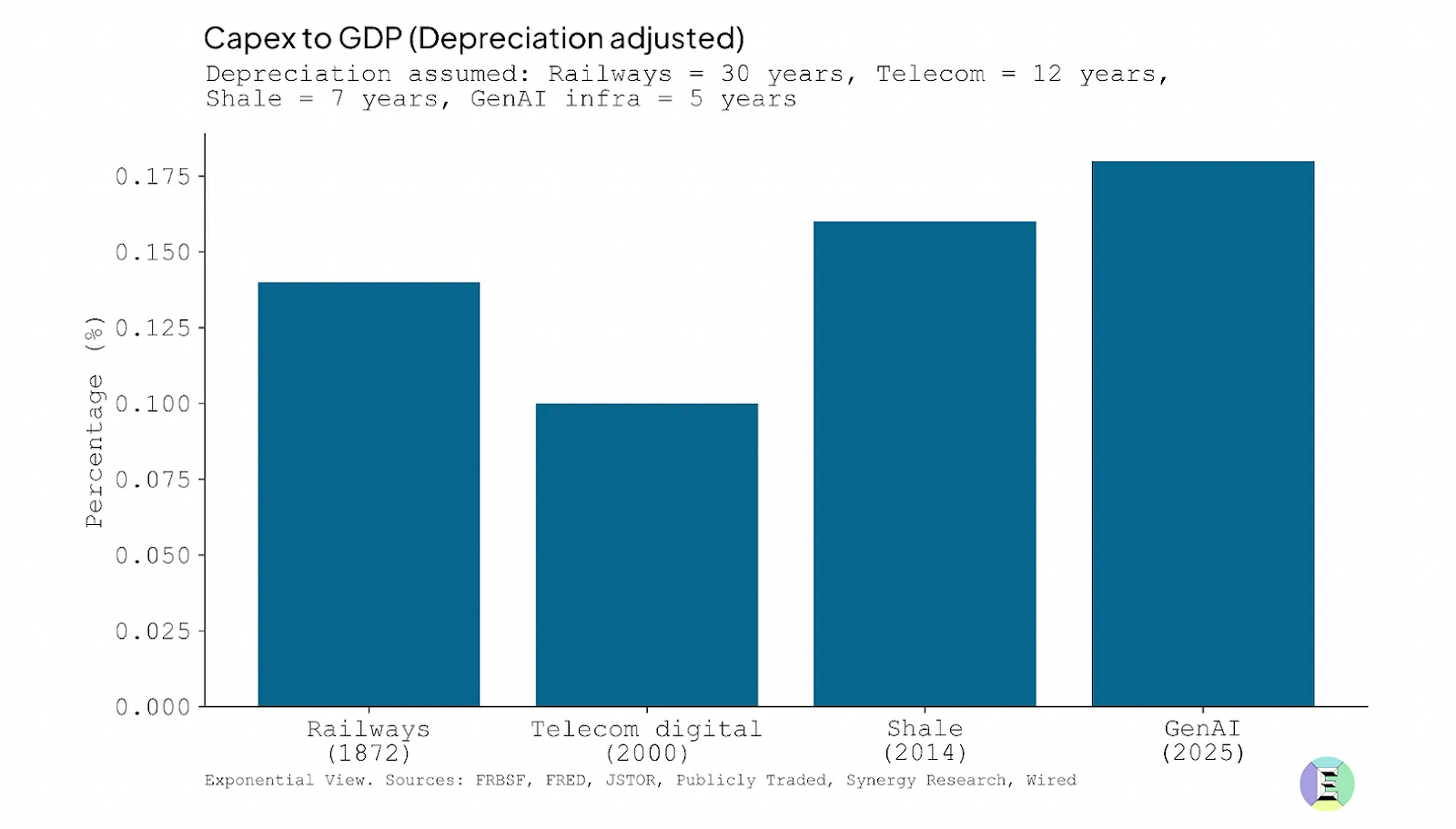 Adjusted for the useful life of the infrastructure built, investment in AI is already bigger than the 19th century investments in railroads. 150 years later, we’re still using some of those railroad tracks. But how long will it be before today’s GPUs are in a landfill? Five years? 10? Not 150, for sure.