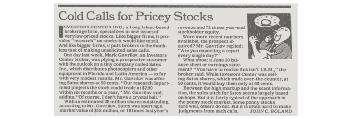(Even more incredibly, a neighboring sidebar profiled the cold-calling brokerage later made famous in the scene from Wolf of Wall Street when Jordan Belfort sells his first penny stock: “Thank you for your vote of confidence and welcome to the Investors Center.”)