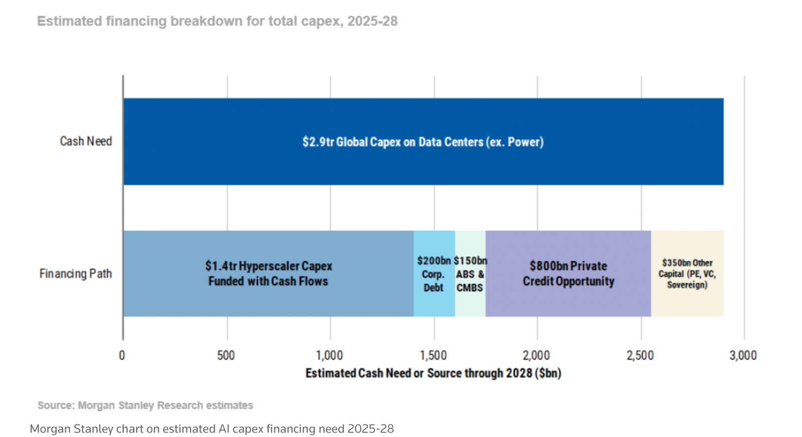 Morgan Stanley estimates that about half of data center spending through 2028 will be covered by hyperscalers’ cash flows, which is pretty good. But financing the other half might lead to trouble in credit markets and possibly the banking system.