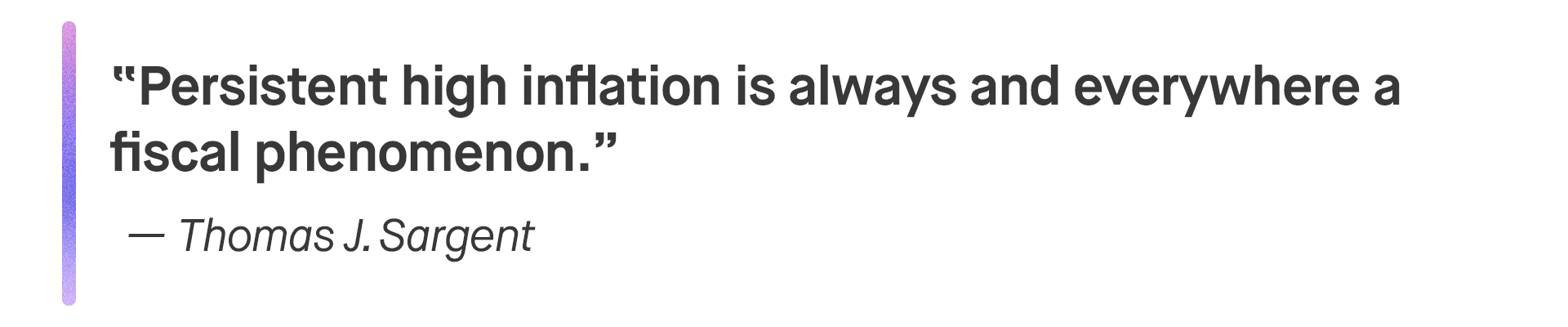 Instead, he says inflation is ultimately a fiscal phenomenon: “With a profligate fiscal policy,” Sargent writes, “it is impossible for a monetary authority to sustain low inflation because the intertemporal government budget then implies that the monetary authority must sooner or later impose a sufficiently large inflation tax to finance the budget.”